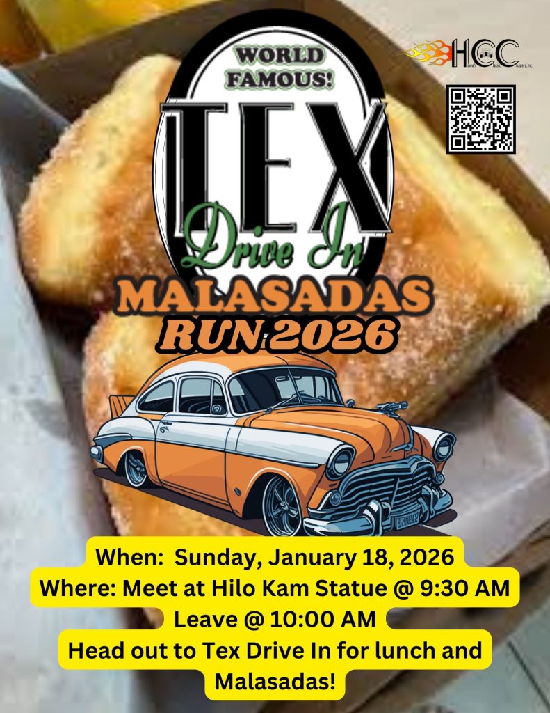 January 18th Tex Drive-in Malasada Run! January 6, 2026 Mark your calandars! Posted in Uncategorized ← Happening Tonight! 1st Saturday of the Month Meet at Taco Bell Puainako!